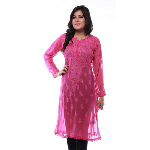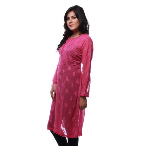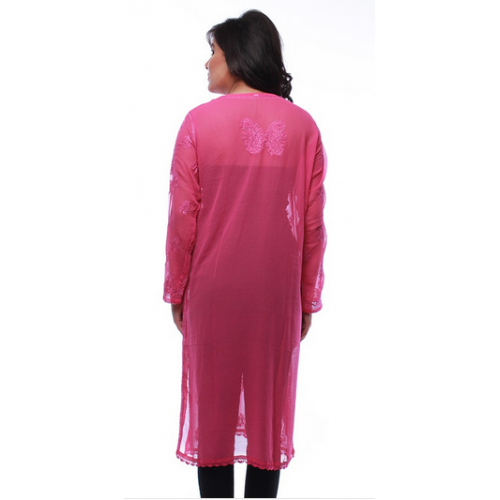 Ada Hand Embroidered Extra Large Magenta Faux georgette Lucknow Chikankari Long Kurti