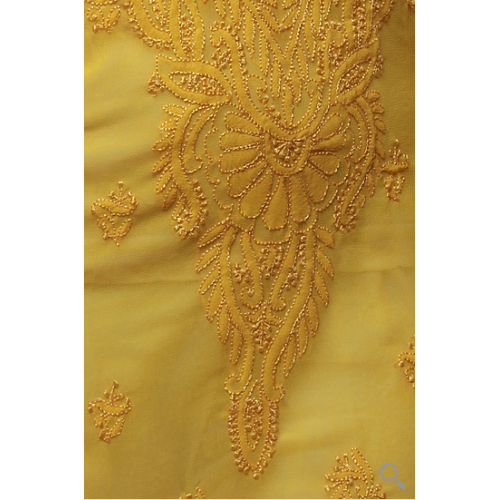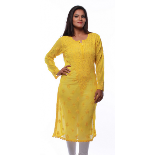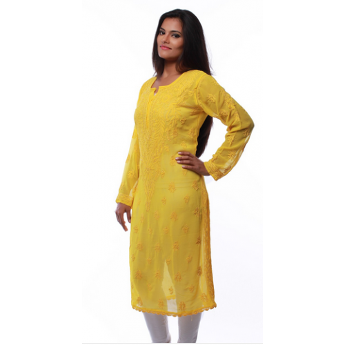 Ada Hand Embroidered Large Yellow Faux Georgette Lucknow Chikankari Long Kurti