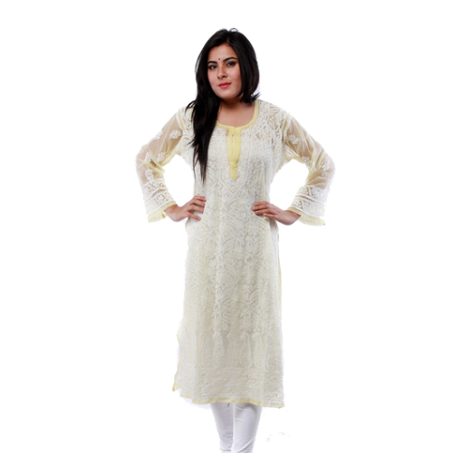 A traditional embroidery style from Lucknow, Ada tempts you with chikankari that can be passed down from generation to generation. Here\'s mouthwatering Fawn Kurti featuring beautiful embroidery of Bakhiya, Phanda and Keel Kangan. This ethnic Kurti is a wardrobe essential. Chest - 44\" Length -45\"