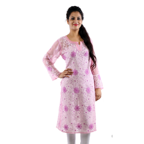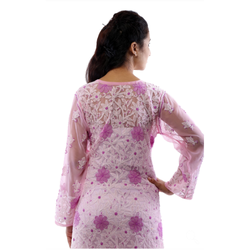Ada Handmade Small Pink Faux Georgette Chikankari Long Kurti
