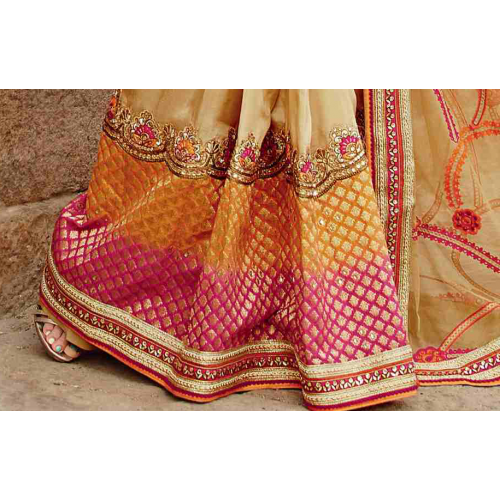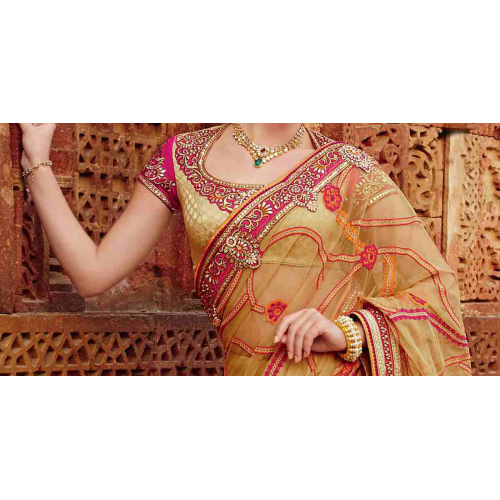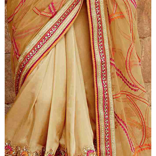 Enchanting Beige Colored Embroidered Tussar Silk Net Saree