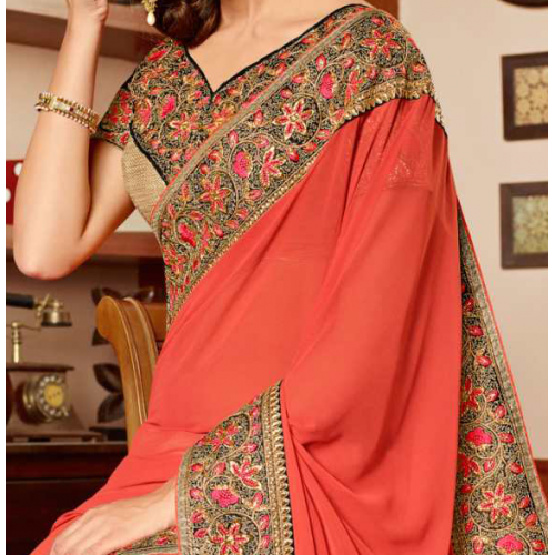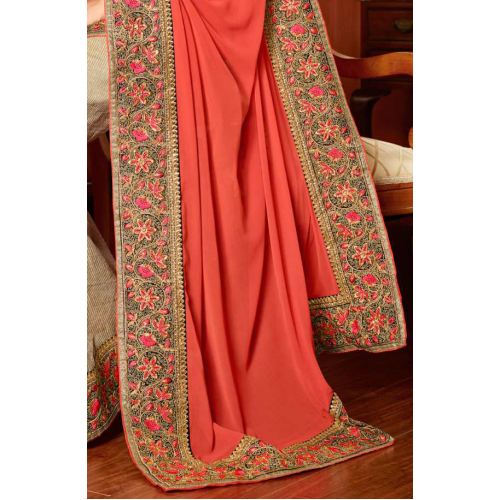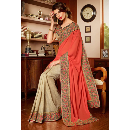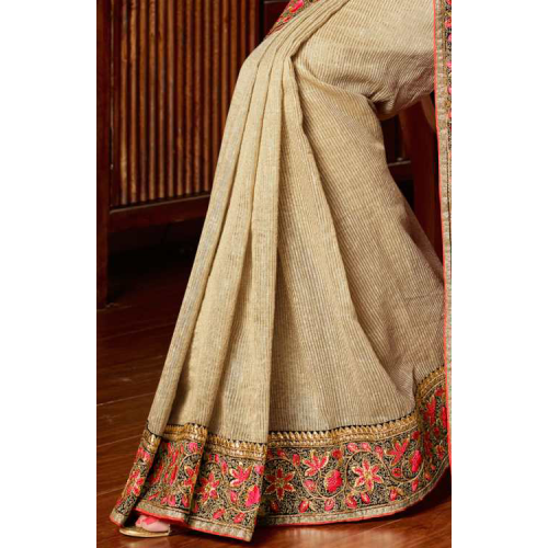 Exquisite Beige Colored Embroidered Georgette Silk Saree