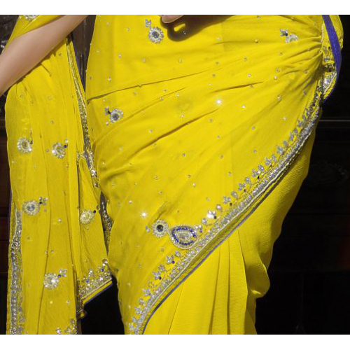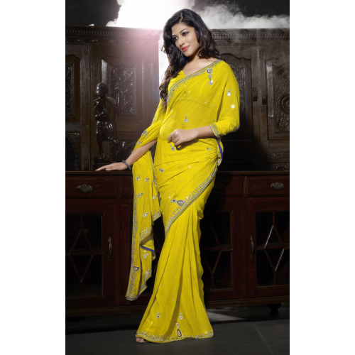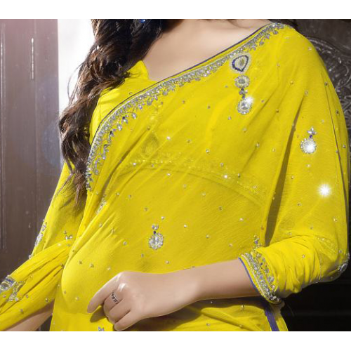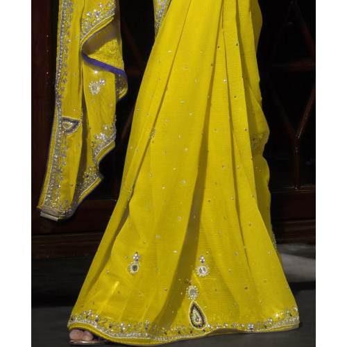 Magnificent Stone Worked Yellow Colored Wedding Wear Chiffon Saree