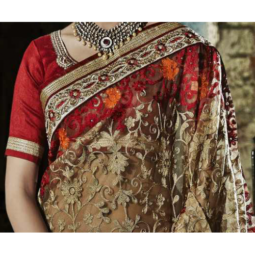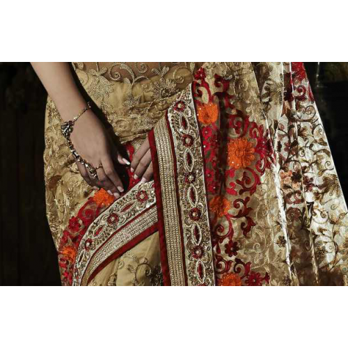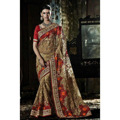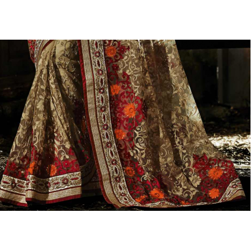 Rattling Beige Colored Woolen Embroidered Net Saree 101B |