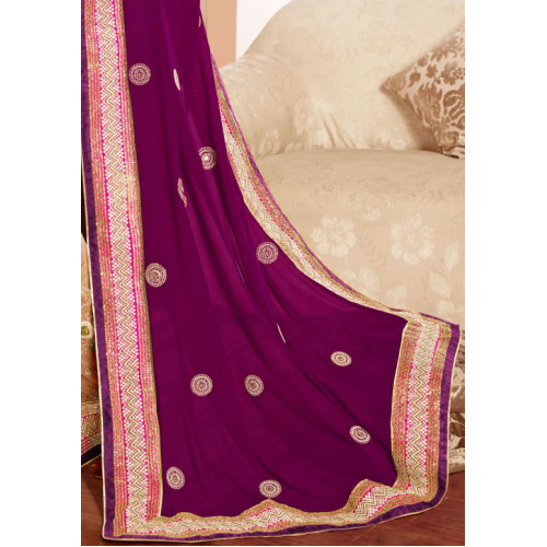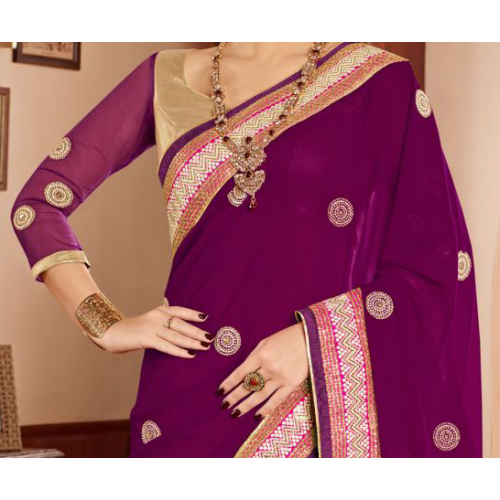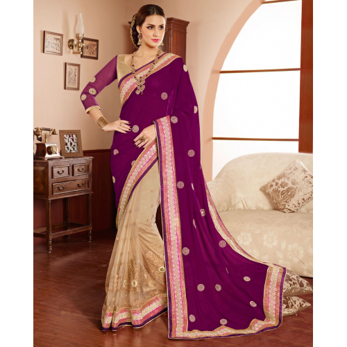 Sensational Beige Colored Embroidered Georgette Net Saree