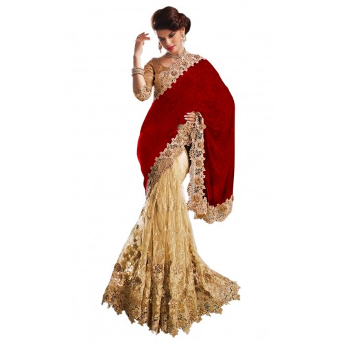 Triveni Captivating Red Colored Embroidered Net Velvet Saree