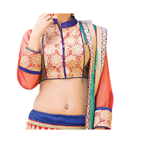 A Choli is a midriff-baring blouse like garment in the Indian sari costume worn in India. The choli is cut to fit tightly to the body and has short sleeves and a low neck. Lehenga is a form of skirt which is long, embroidered and pleated. It is secured at the waist and leaves the lower back and midriff bare. The third part of Lehenga Choli is the Dupatta, or the scarf. The garment is unstitched, consisting of the 3 pieces above, loosely attached together. The garment is unstitched.