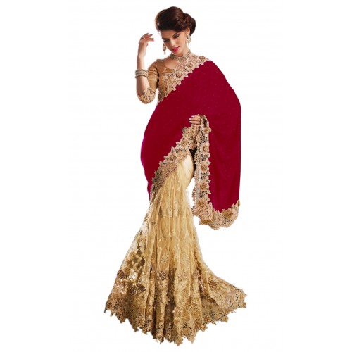 Triveni Enchanting Magenta Colored Embroidered Net Velvet Saree
