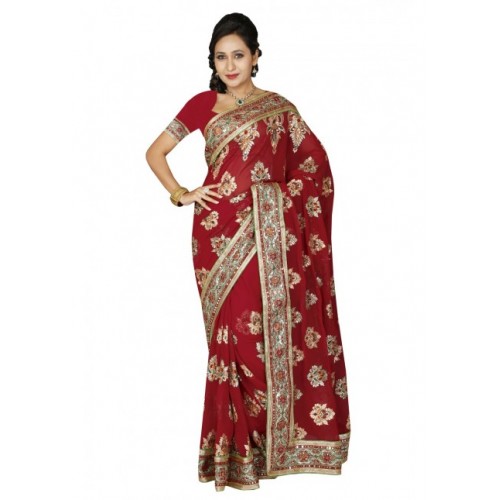 Fantastic Maroon Colored Embroidered Faux Georgette Saree