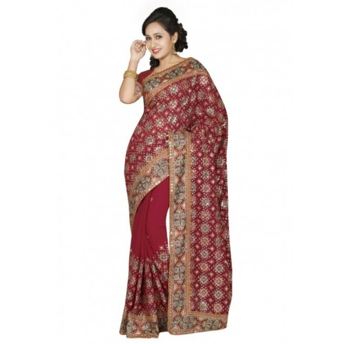 Splendid Maroon Colored Embroidered Faux Georgette Saree