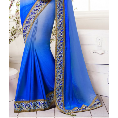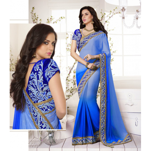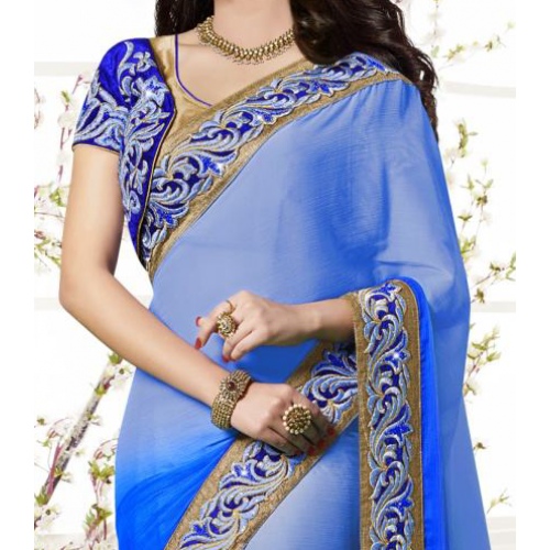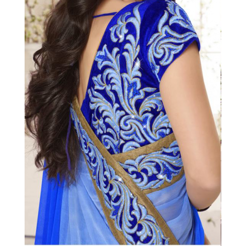 Luxurious Blue Colored Embroidered Faux Chiffon Saree