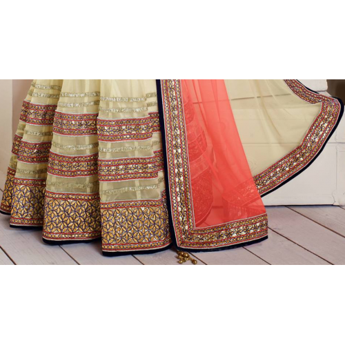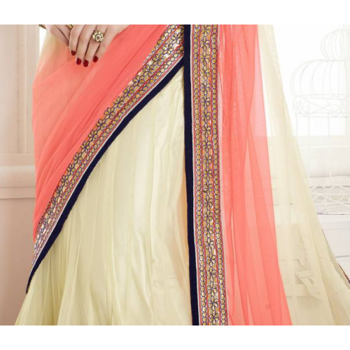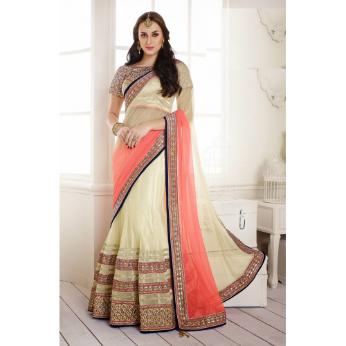 Stunning Cream Colored Embroidered Net Satin Lehenga Saree