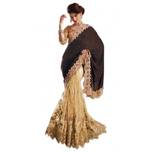 Triveni Luxurious Brown Colored Embroidered Net Velvet Saree